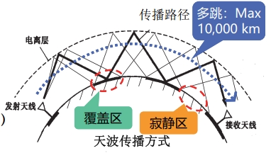 天波(sky-wave):频率介于2~30MHz,被电离层反射,传播距离(一跳)小于4000km,多跳可达10000km,常用于远程、短波通信