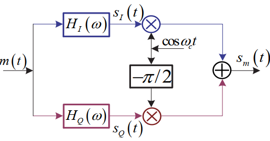 LLSB(t)=21Amcos(ωc−ωm)t=21Amcosωmtcosωct+21Amsinωmtsinωct=21m(t)cosωct+21m(t)^sinωctLUSB(t)=21Amcos(ωc+ωm)t=21Amcosωmtcosωct−21Amsinωmtsinωct=21m(t)cosωct−21m(t)^sinωct其中m(t)^是m(t)的希尔伯特变换,m(t)^=Amsinωmt,含义:幅度不变,相移π/2,希尔伯特变换的传输函数: