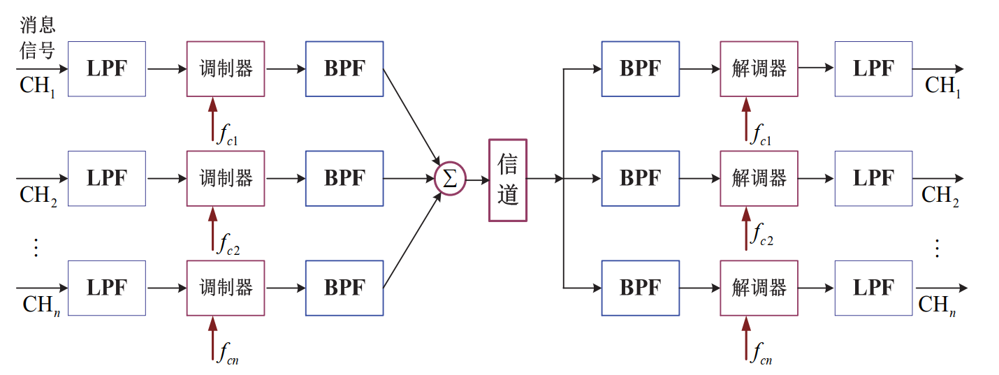 方法:调制→合成→传输→分路→解调